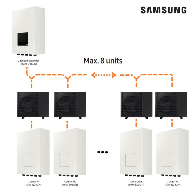 The MIM-E03GN is compatible with all Samsung heat pumps, excluding the integrated R290s. If you are installing the integrated r290 gen7 heat pumps in a cascade, the cascade control kits (MIM-E03GN) are not required, but the master control (MCM-D3E0N) is still required.